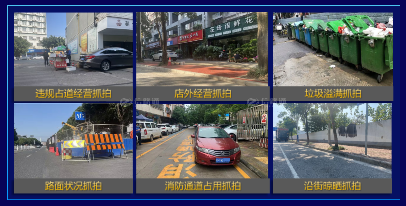 “新一代”視頻巡檢車還可以進行AI典型城管秩序類抓拍:違規占道經營、店外經營、垃圾溢滿、路面狀況、消防通道占用、沿街晾曬等。