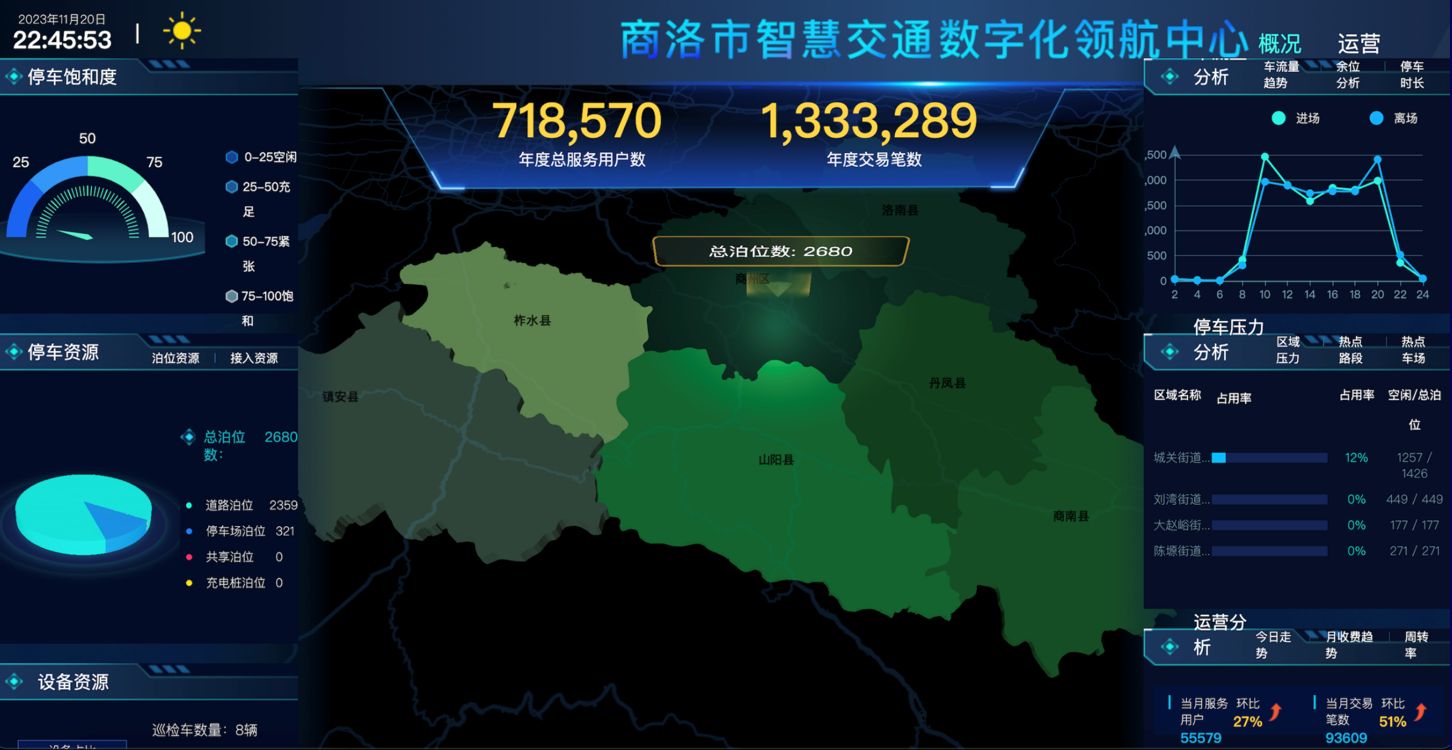 商洛市商州區智慧停車項目,一共管理了1800個泊位,2023年6月新增5臺巡檢車上線正式運營,750個泊位使用純視頻巡檢車模式,配置5個巡檢員、5個貼單員,巡檢員15分鐘一輪,視頻巡查車抓拍在場車輛信息經路通物聯2.0(PaaS)透傳至業務平臺。視頻巡查車抓拍在場車輛信息作為停車收費證據,后期正在規劃安裝地磁配合巡檢車使用。